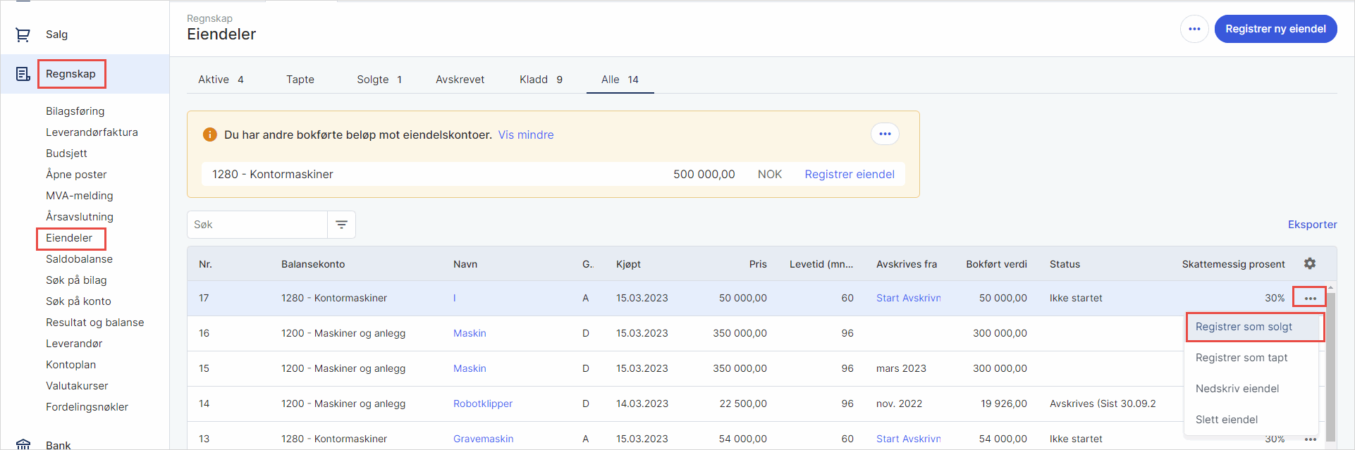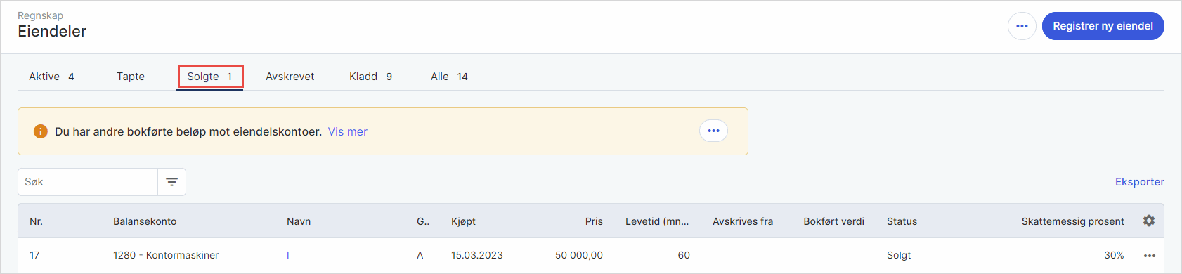 NB: Dersom du bruker automatiske avskrivninger, er det viktig å huske at eiendelen bare er avskrevet frem til utgangen av forrige måned. Dersom du selger eiendelen før eller etter dette, må avskrivinger først bokføres/korrigeres manuelt i regnskapet for å få riktig regnskapsverdi ved salg.