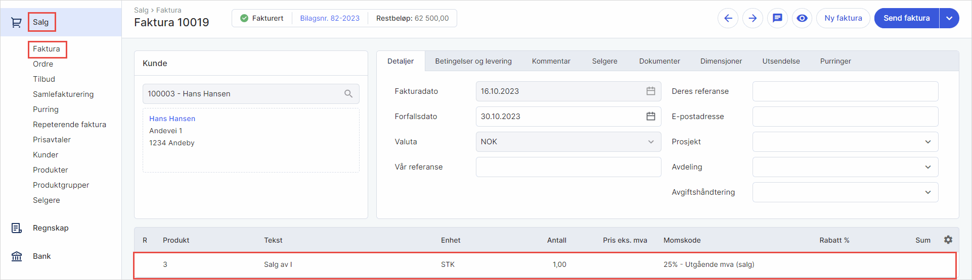 5. Gå til Salg i venstremenyen og til Faktura. Du vil nå finne en autogenerert faktura med salg av eiendelen.