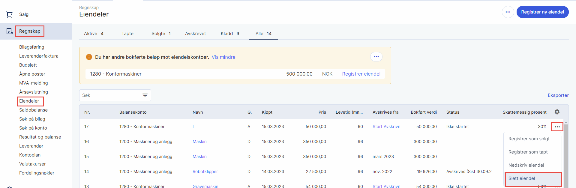 I utgangspunktet bør du kun slette en eiendel dersom den ikke tidligere har blitt avskrevet i regnskapet, eller hvis den ble lagt inn ved en feil. I noen tilfeller har automatiske avskrivninger blitt aktivert på en eiendel ved registrering, med tilhørende genererte bilag tilbake til kjøpstidspunktet. Dersom dette er tilfelle og eiendelen ikke hører hjemme i regnskapet, kan den likevel slettes.