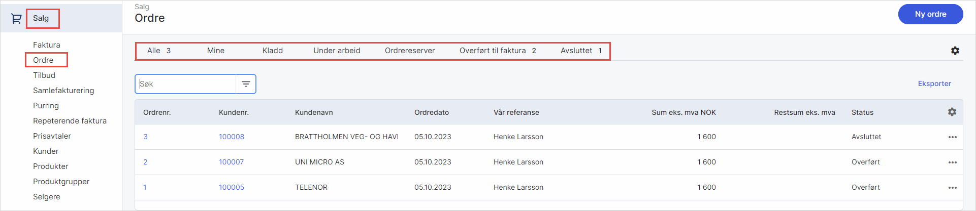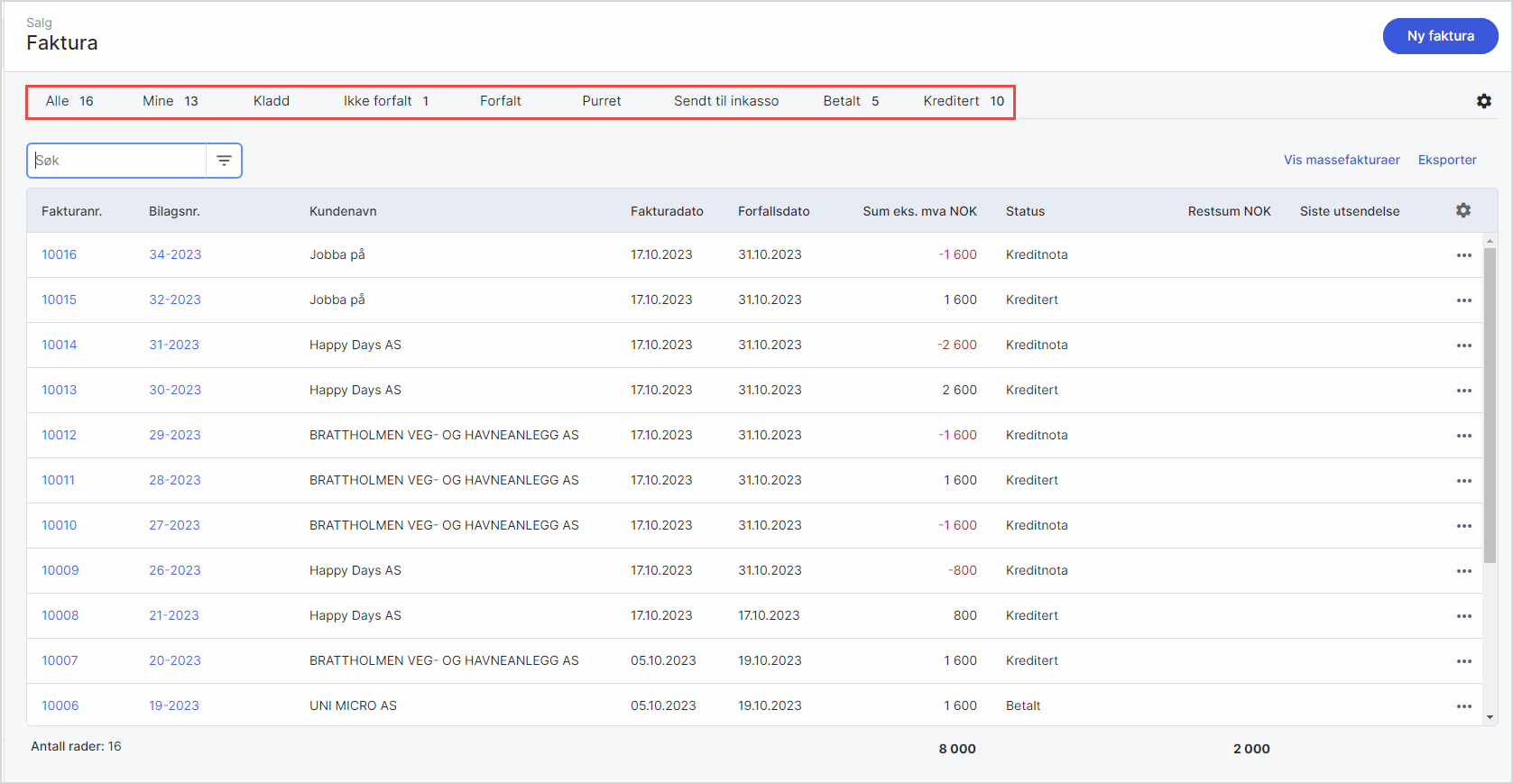 Statusfaner i faktura, ordre og tilbud Sist oppdatert 20.08.2025 Statusfaner i Faktura Alle er alle fakturaer som er opprettet på selskapet, også eventuelle kreditnotaer. Mine er fakturaer som er opprettet av din personlige bruker. Kladd er fakturaer som er lagret som kladd. Ikke forfalt er fakturaer som er opprettet og fakturert, men som ikke har forfalt. Forfalt er fakturaer som er opprettet og fakturert, og som har forfalt. Purret er fakturaer som er purret. Sendt til inkasso er fakturaer som er sendt til inkasso. Betalt er fakturaer som er blitt betalt av kunde. Kreditert er fakturaer som er kreditert og deres respektive kreditnotaer. Statusfaner i Ordre Alle er alle ordrer som er opprettet på selskapet. Mine er ordrer som er opprettet av din personlige bruker. Kladd er ordrer som er lagret som kladd. Under arbeid og Ordrereserver er ordrer som er registrert og som fremdeles er under arbeid. Overført til faktura er ordrer som er blitt overført til faktura. Avsluttet er ordrer som er avsluttet. Statusfaner i Tilbud Alle er alle tilbud som er opprettet på selskapet. Kladd er tilbud som er lagret som kladd. Under arbeid er tilbud som er registrert og som fremdeles er under arbeid. Overført ordre er tilbud som er blitt overført til en ordre. Overført til faktura er tilbud som er overført til en faktura. Avsluttet er tilbud som er avsluttet.
