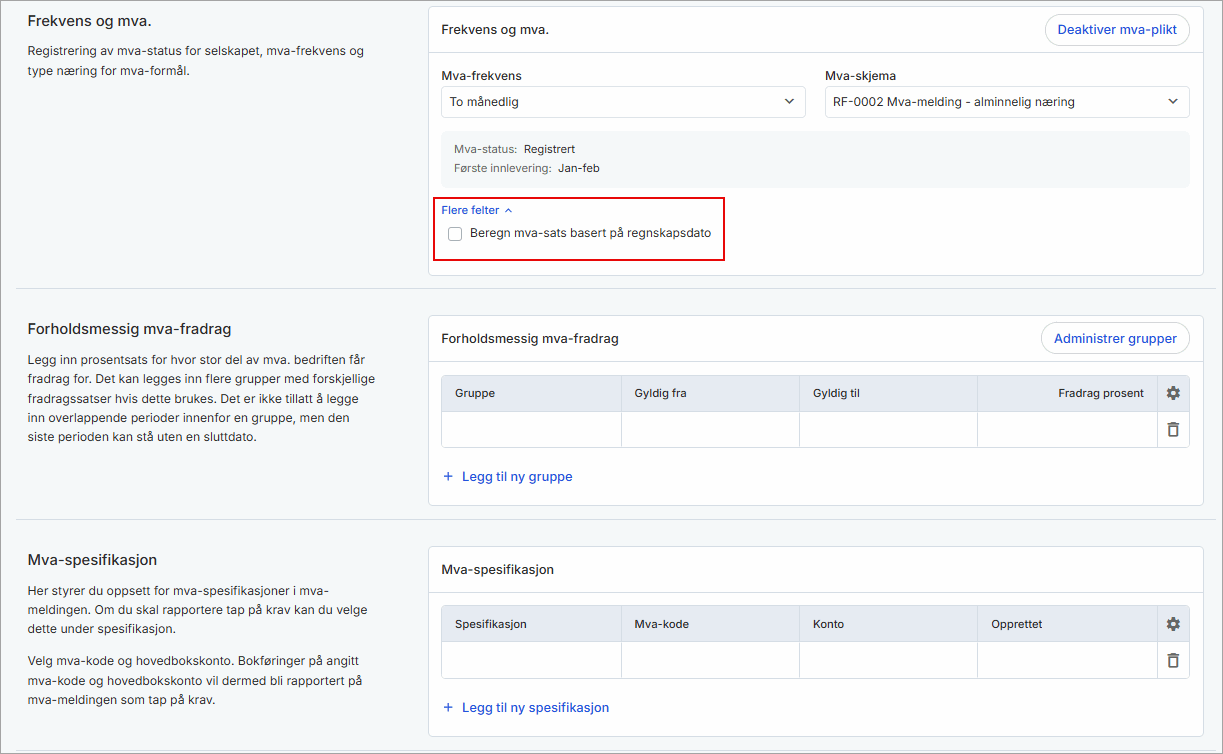 - Under Frekvens og mva. og Flere felter kan du sette hake for Beregn MVA-sats basert på regnskapsdato.
