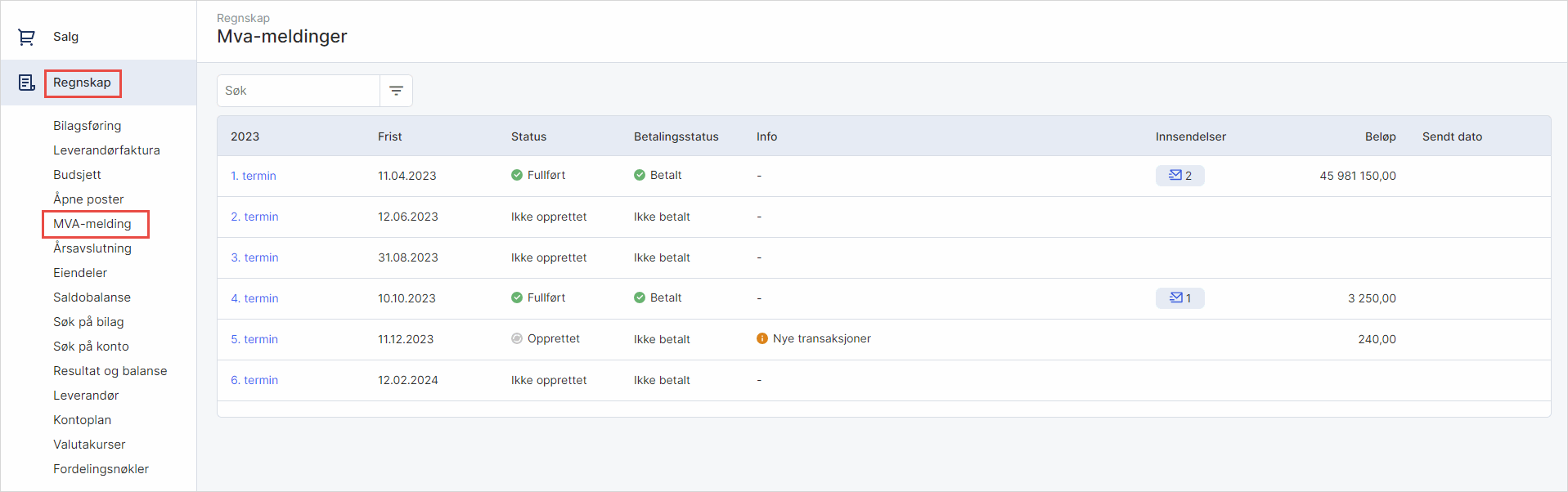Innsendelser: Alle mva-innsendinger for terminen.