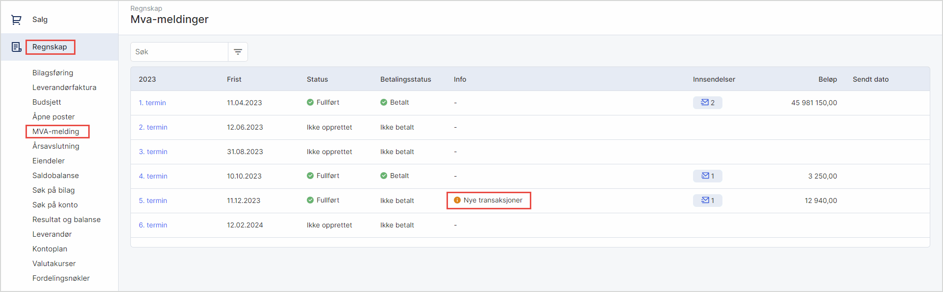 Over mva-oppgaven vil du nå få beskjed om at nye transaksjoner er registrert på denne terminen etter sist innsendelse.