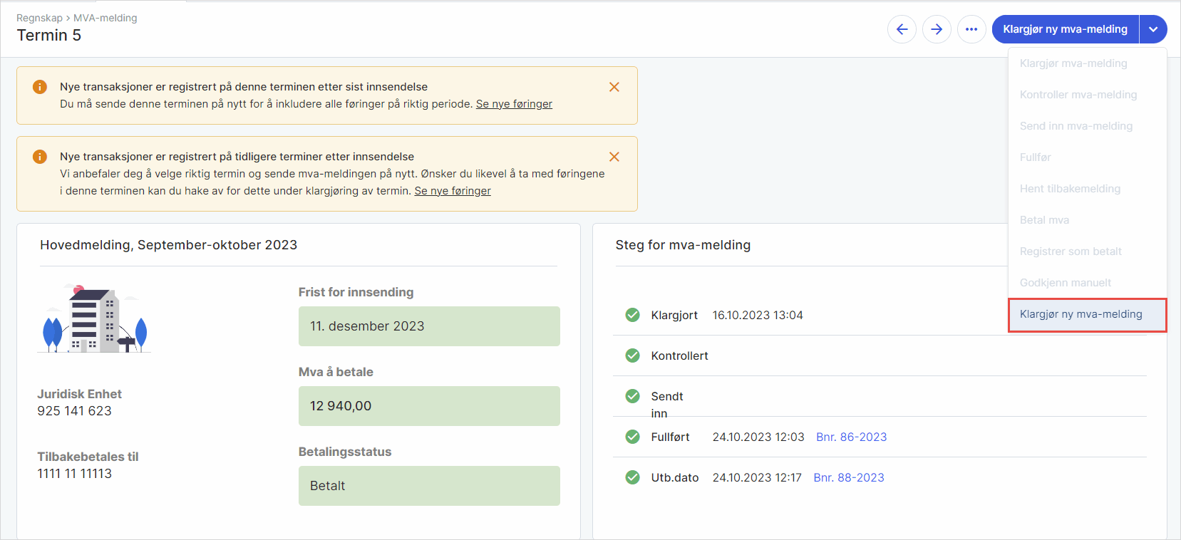 2. Klikk på Klargjør ny mva-melding. Den nye mva-meldingen vil overskrive den forrige, som krediteres og slettes.