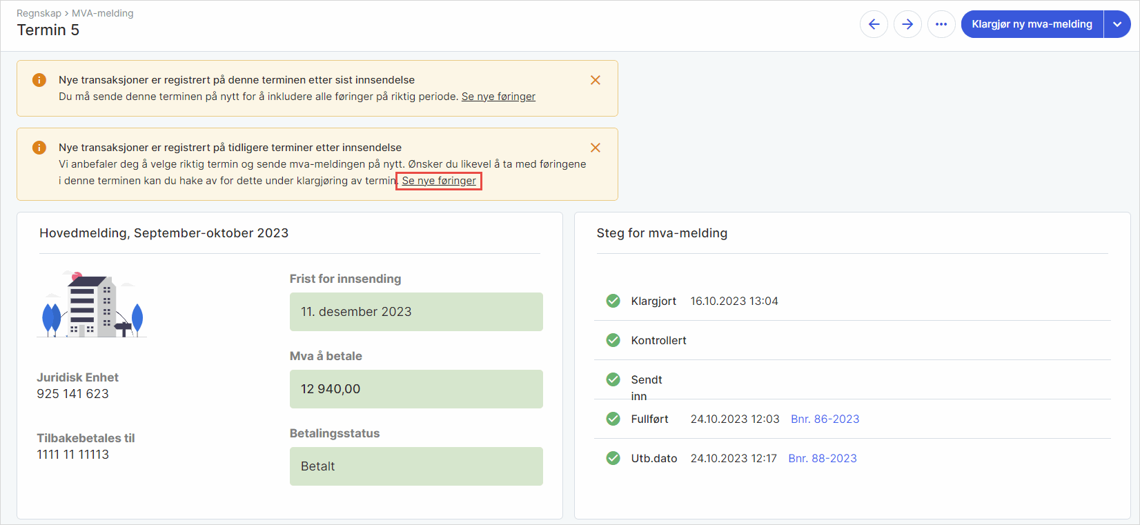 Hvis du har bilag fra tidligere terminer som ikke er gjort opp for i den terminen de tilhører, kan du kjøre mva-oppgjør for bilagene i en annen termin. Eksemplet under vises når bilag er bokført i en tidligere termin, men de er blitt tatt med i oppgjøret for neste termin. Dersom det er ført bilag i en tidligere termin etter innsending av denne, vil du få beskjed om at Nye poster er registrert på tidligere terminer etter innsendelse. Du kan se føringene som ikke er oppgjort ved å klikke på Se nye føringer. Dersom du ønsker å ta med disse posteringene fra tidligere perioder, sender du inn ny mva-melding.