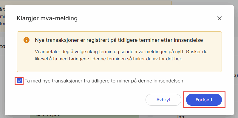 2. Sett hake ved Ta med nye transaksjoner fra tidligere terminer på denne innsendelsen. Da vil posteringer fra tidligere terminer bli inkludert på dette oppgjøret.