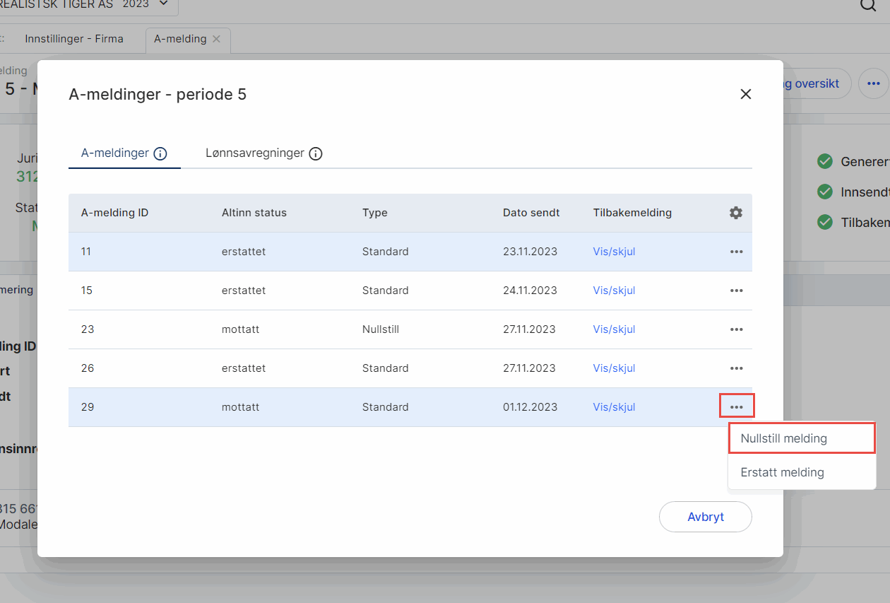 5. Klikk på de tre kulepunktene og velg Nullstill melding. Dersom du har sendt flere meldinger for samme periode vil du finne disse i tabellen. Feltet Type kan fortelle deg noe om innholdet i meldingen; arbeidsforhold, standard (også kalt full a-melding), tillegg eller nullstilling.
