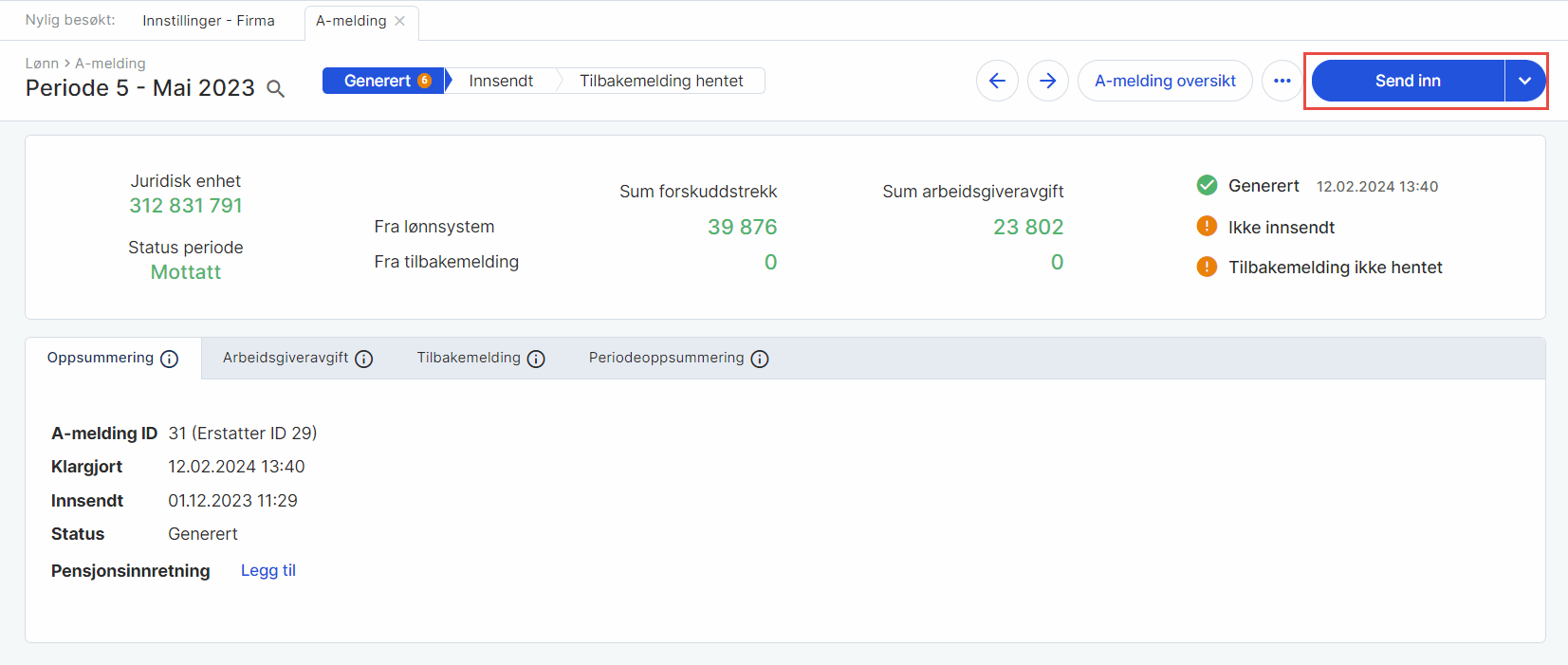 6. Klikk på Send inn. På samme måte som en vanlig a-melding, må også nullstillingen sendes inn til Altinn.