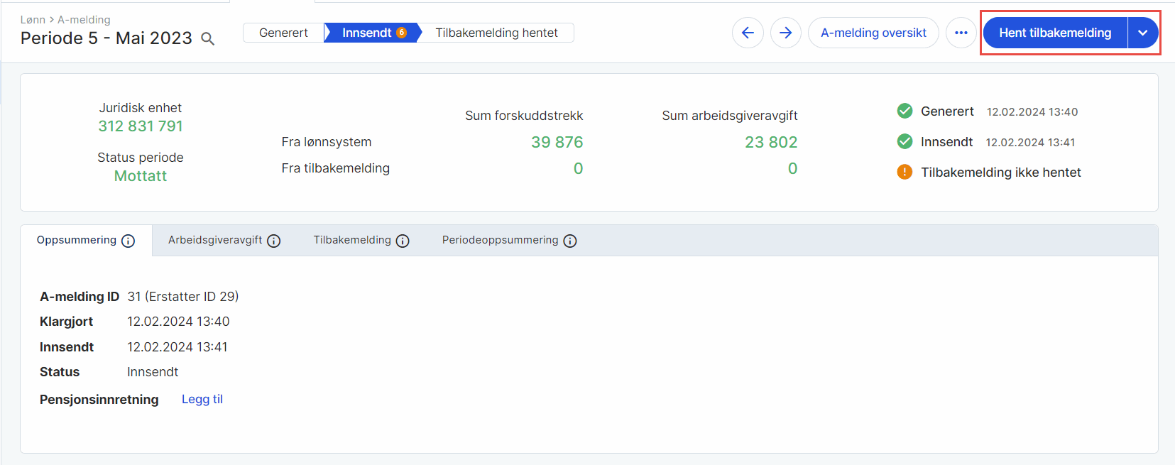 7. Klikk på Hent tilbakemelding. På samme måte som en vanlig a-melding må også nullstillingen hentes fra Altinn.