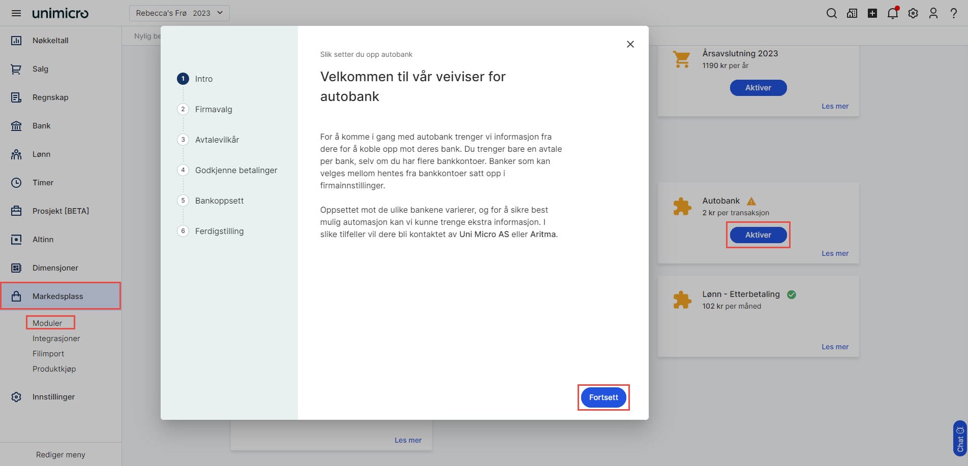 1. Gå til Markedsplass i venstremenyen og velg Moduler. Klikk på Aktiver under Autobank.
