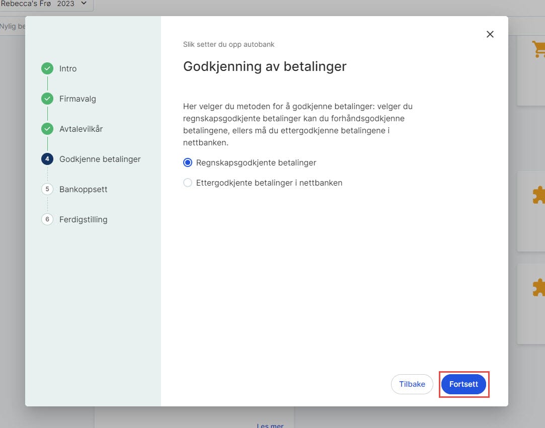 2. Etter aktivering skal du ferdigstille oppsettet via en veiviser. Du velger nå hvordan du ønsker å godkjenne betalinger. Velger du RGB kan du forhåndsgodkjenne betalingene direkte i regnskapssystemet. Alternativt må du ettergodkjenne betalingene i nettbanken.