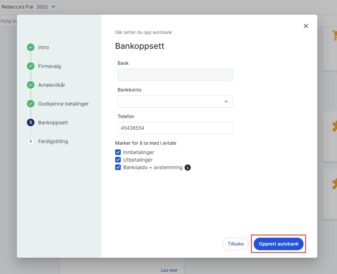 3. Legg inn bankkontonummer og sett hake ved ønsket funksjonalitet for avtalen. I feltet Telefon legger du inn det samme telefonnummeret som er registrert under to-faktor for brukerinnstillinger. Klikk på Opprett autobank.