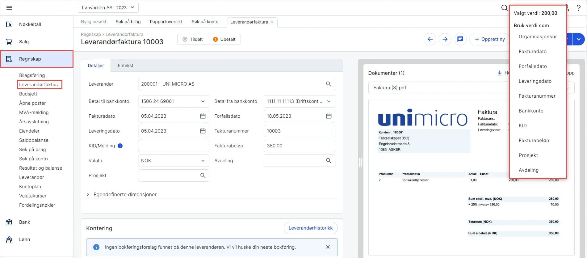 Tolken husker nå dette feltet og skal i utgangspunktet bruke Sum å betale som verdi Fakturabeløp neste gang du får en faktura fra samme leverandør. Dette må gjerne gjentas noen ganger før tolken er ferdig opplært. Du kan med fordel tidvis kontrollere at tolken henter riktige data, slik at du slipper å korrigere dette i regnskapet på et senere tidspunkt.