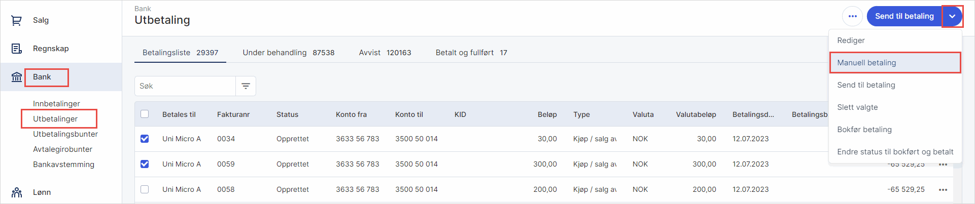3. Klikk på pilen til høyre for Send betaling og velg Manuell betaling. Hvis du ikke har Autobankavtale, vil dette være det eneste betalingsvalget.