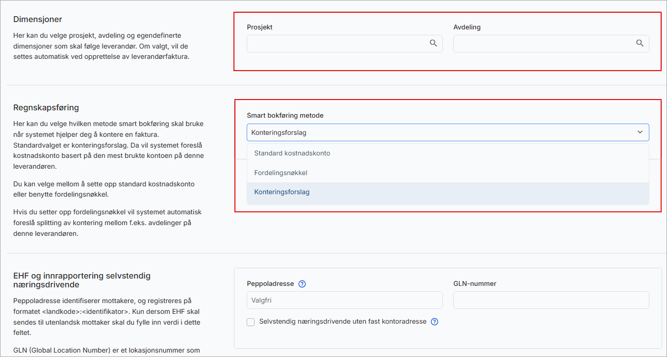 8. Ved feltet Regnskapsføring kan du velge mellom ulike metoder som smart bokføring skal bruke på en inngående faktura som opprettes. Som standard er Konteringsforslag valgt. Med konteringsforslag vil systemet foreslå kostnadskonto basert på den mest brukte kontoen på aktuell leverandør. Du kan også velge å angi standard kostnadskonto eller fordelingsnøkkel som metode.
