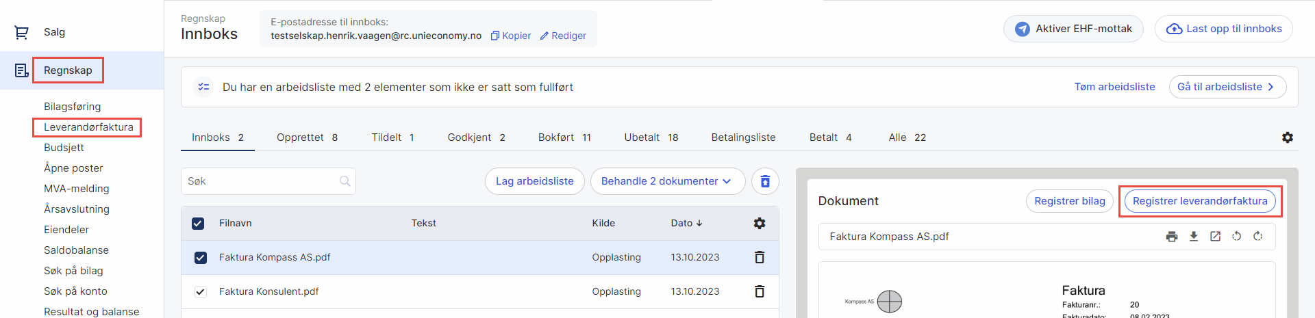 1. Gå til Regnskap i venstremenyen og velg Leverandørfaktura. I innboksen finner du alle filer som er lastet opp, sendt inn til e-postmottaket eller kommet inn som EHF.