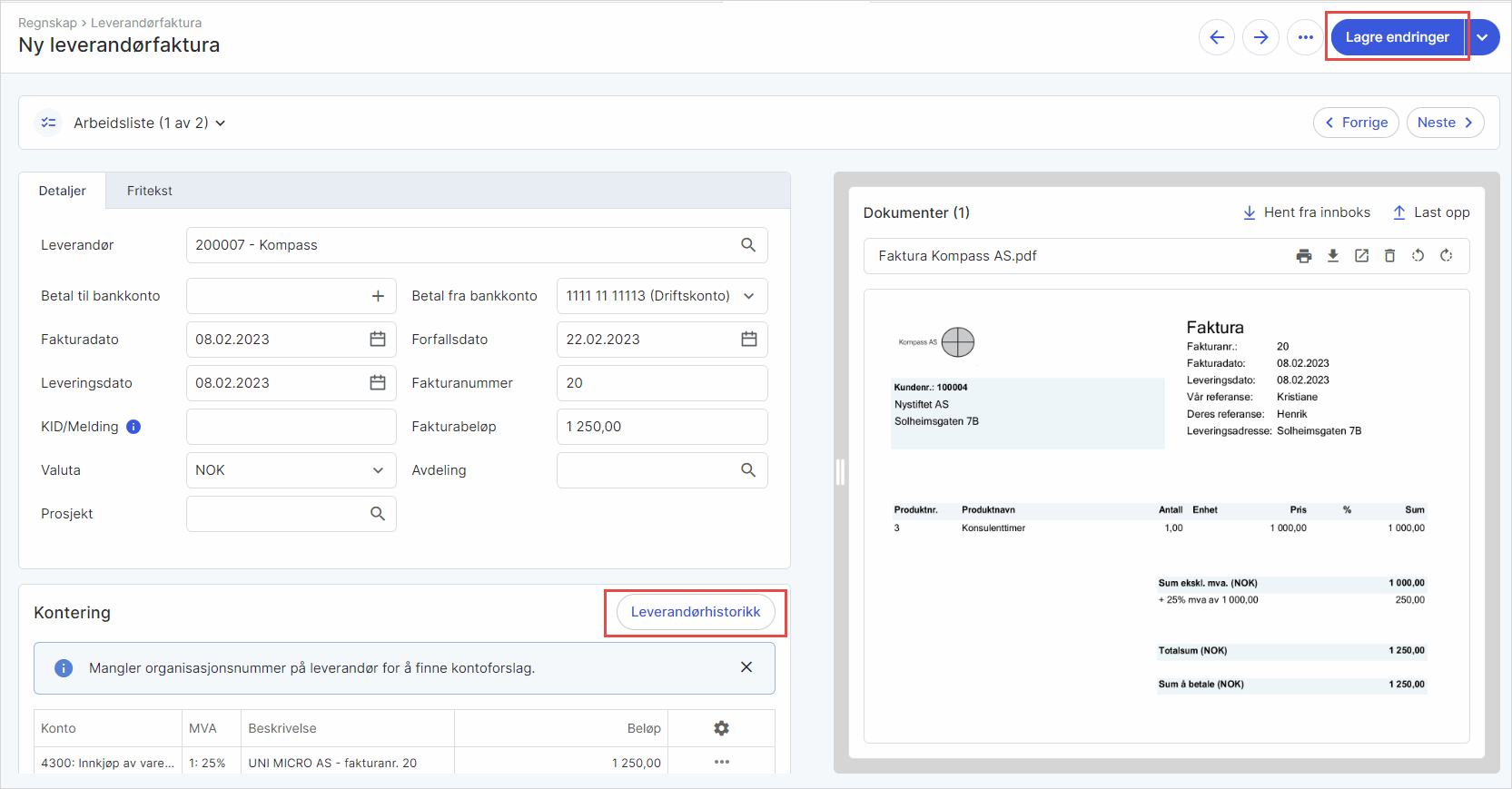 Under Leverandørhistorikk finner du bilagsnummer, hvem som har bokført og utført handlingen.