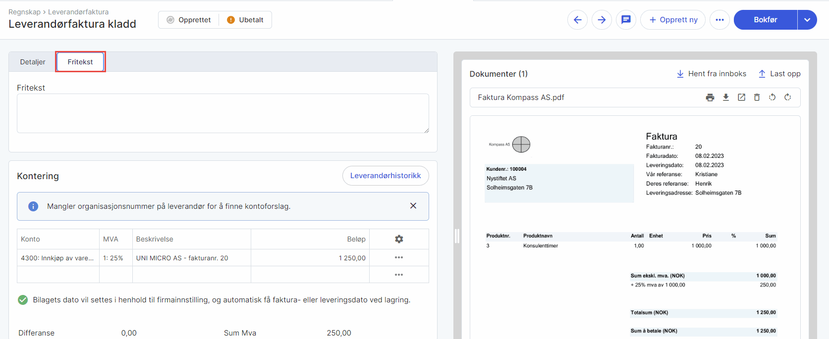 Du kan skrive spesielle merknader eller kommentarer om en leverandørfaktura under fanen Fritekst. Feltet er kun synlig inne i systemet, og kan endres når som helst i fakturaflyten.