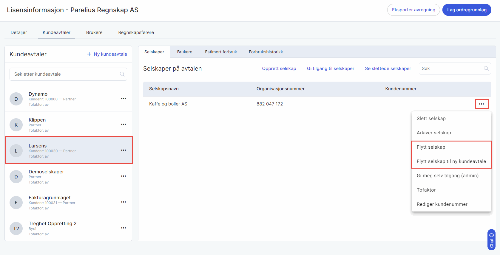 1. Velg en av kundeavtalene og klikk på de tre kulepunktene på det selskapet du ønsker å flytte.