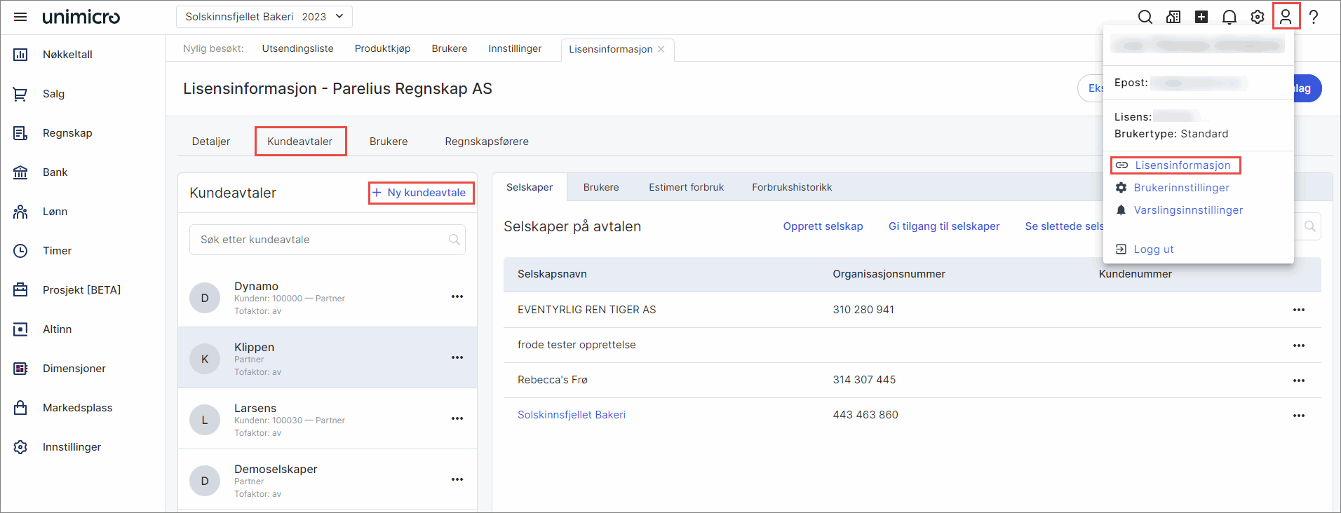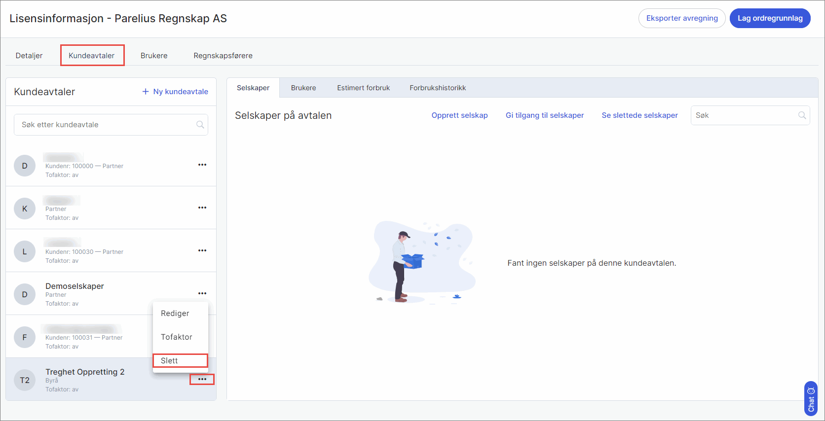 Merk at du ikke kan slette en kundeavtale dersom den inneholder selskaper.