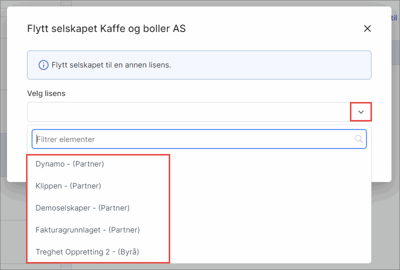 Hvis du velger Flytt selskap vil du få opp eksisterende lisenser å flytte selskapet til.