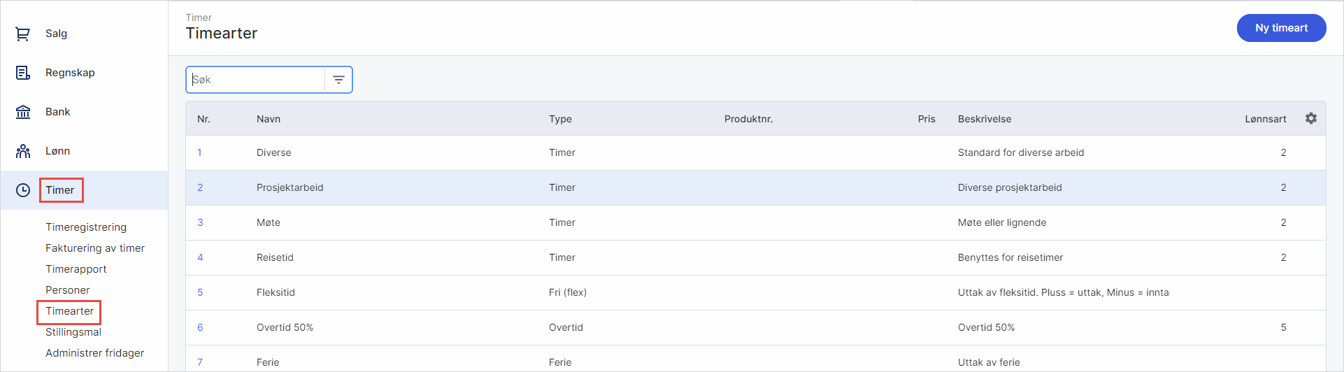 1. Gå til Timer i venstremenyen og velg Timearter. Hent frem den timearten du ønsker å aktivere opprunding av timer på.