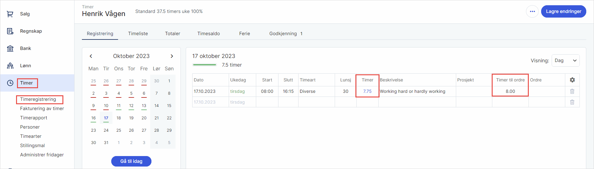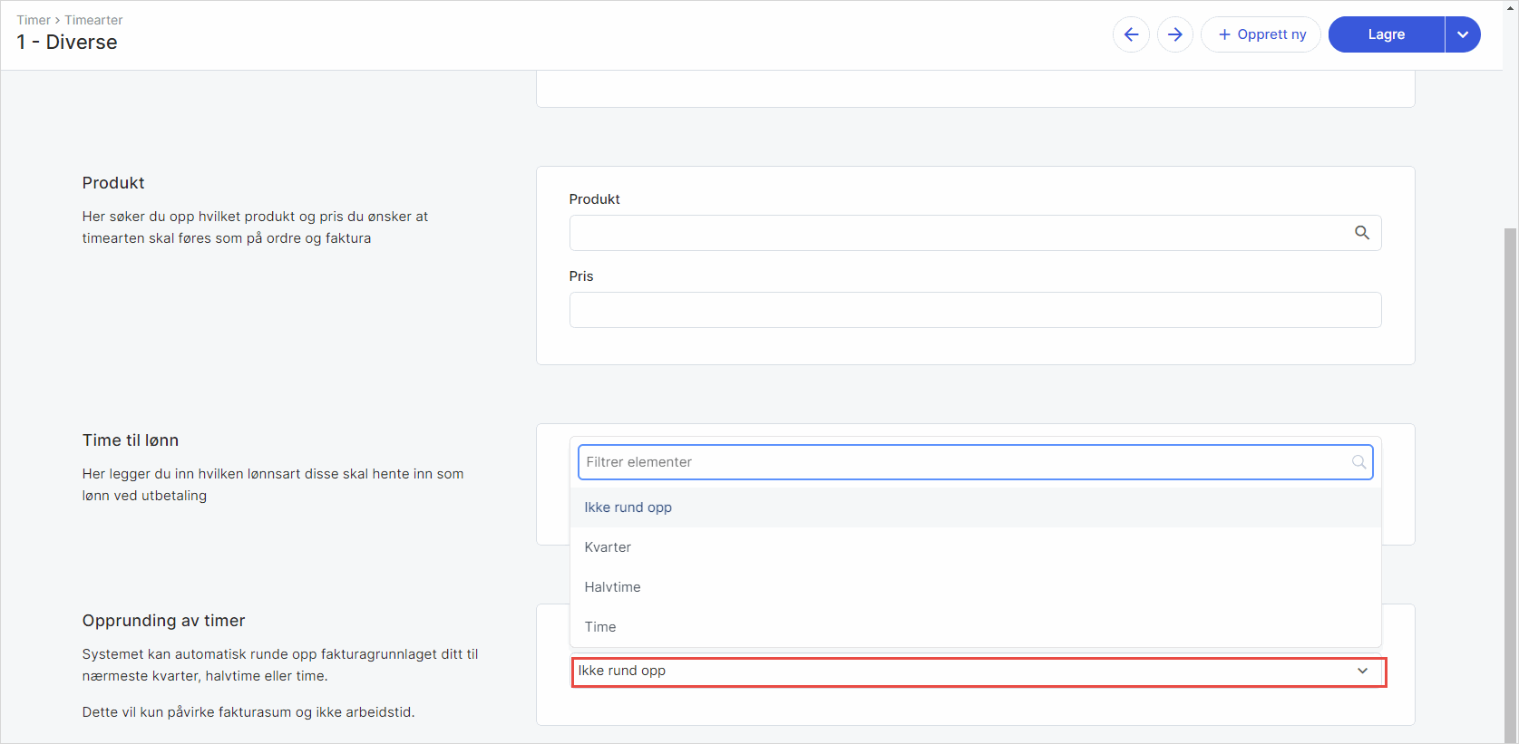Merk at opprundingen kun påvirker timer til ordre som faktureres, og ikke den faktiske registrerte tiden under Timeregistrering.