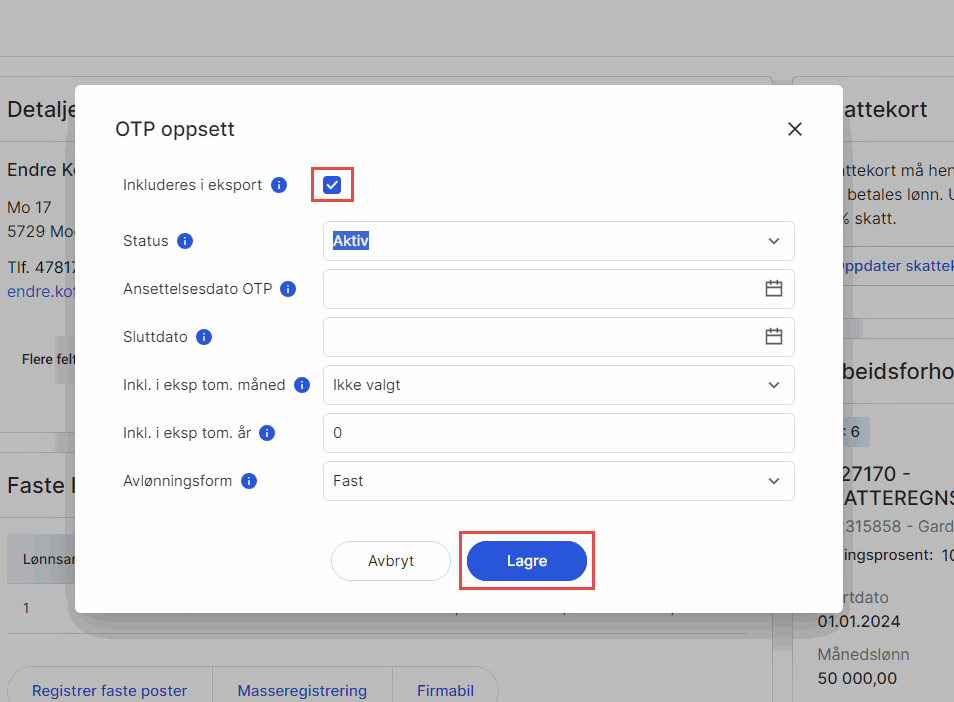 4. Sett hake ved Inkluderes i eksport for å inkludere aktuell ansatt i OTP-eksport.