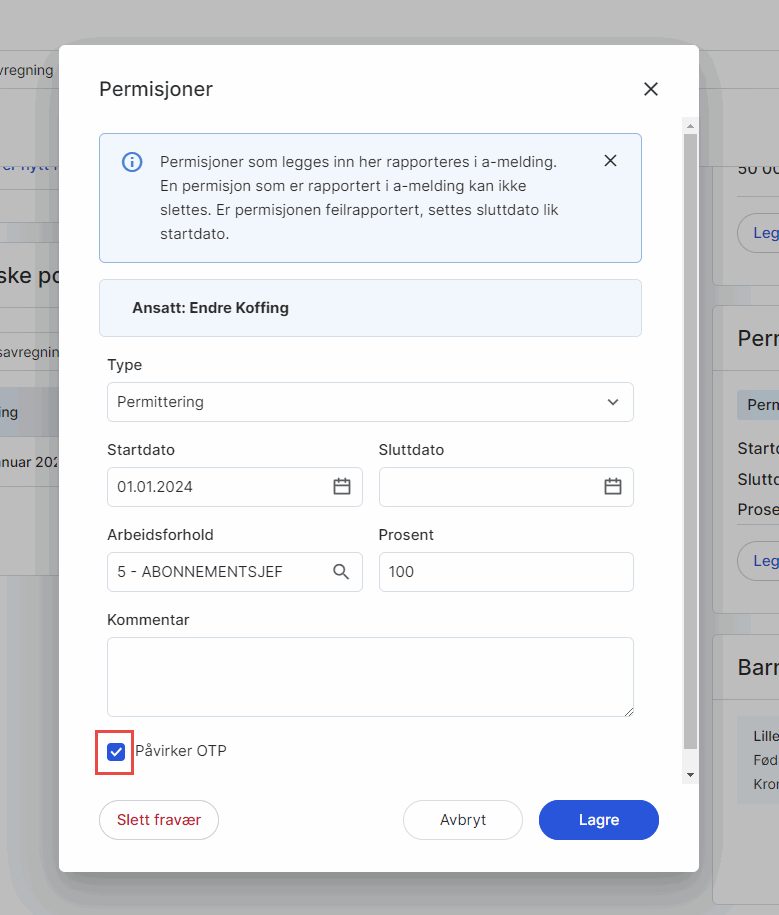 Sett hake ved Påvirker OTP dersom en permisjon skal redusere årslønn og stillingsprosent. Dette feltet må vedlikeholdes manuelt.