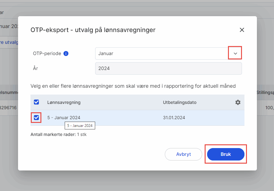 2. Velg OTP-periode og sett hake ved aktuelle lønnsavregning(er).
