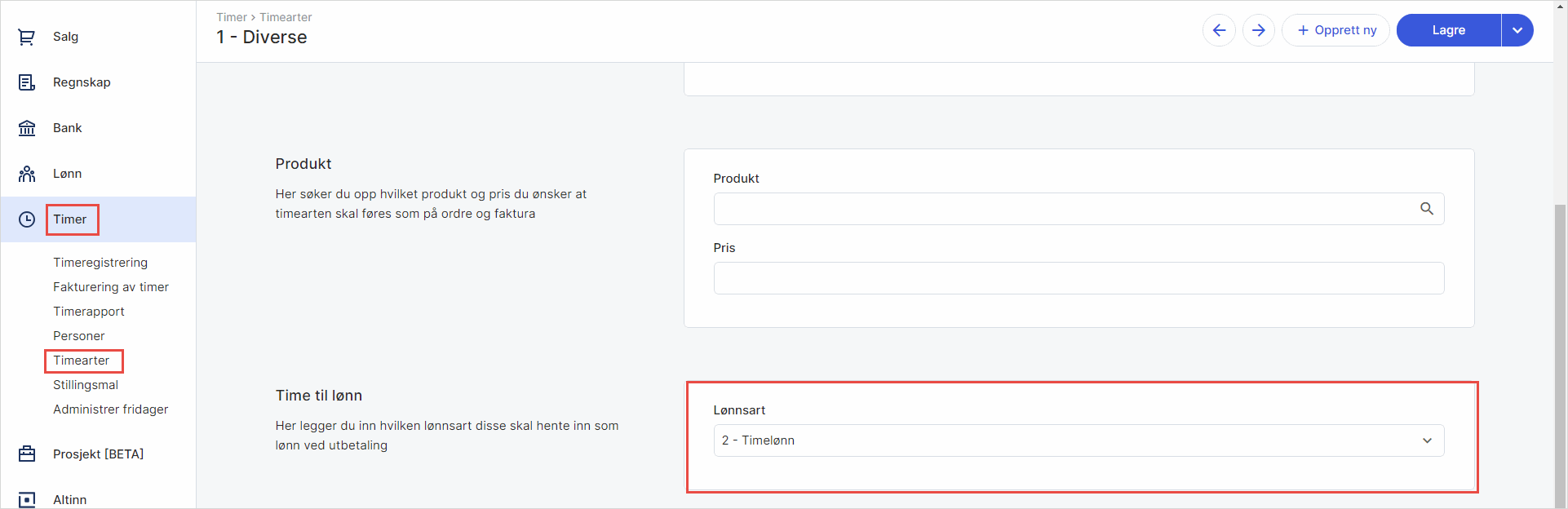 1. Gå til Timer i venstremenyen, og klikk på Timearter. Timearten som brukeren benytter må være koblet mot en Lønnsart.