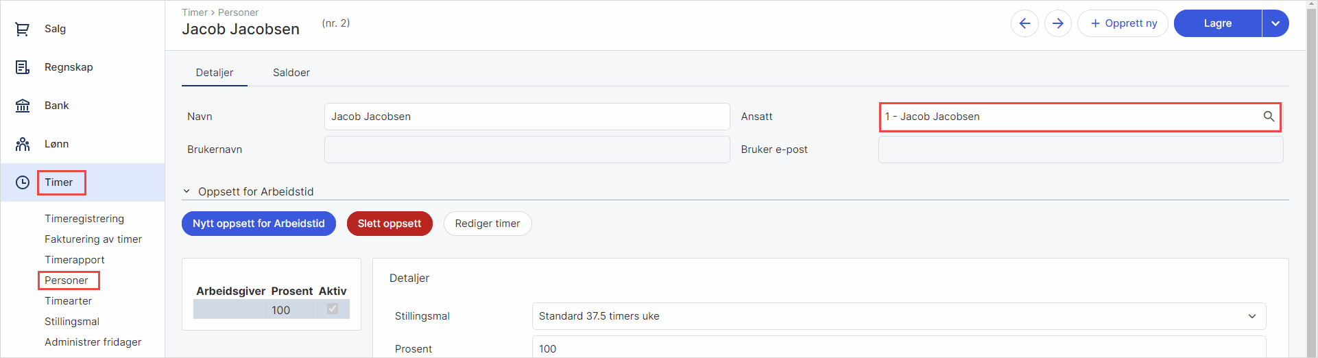2. Gå til Timer i venstremenyen, og Personer. Klikk på aktuell person. Under fanen Detaljer knytter du personen opp mot Ansatt.