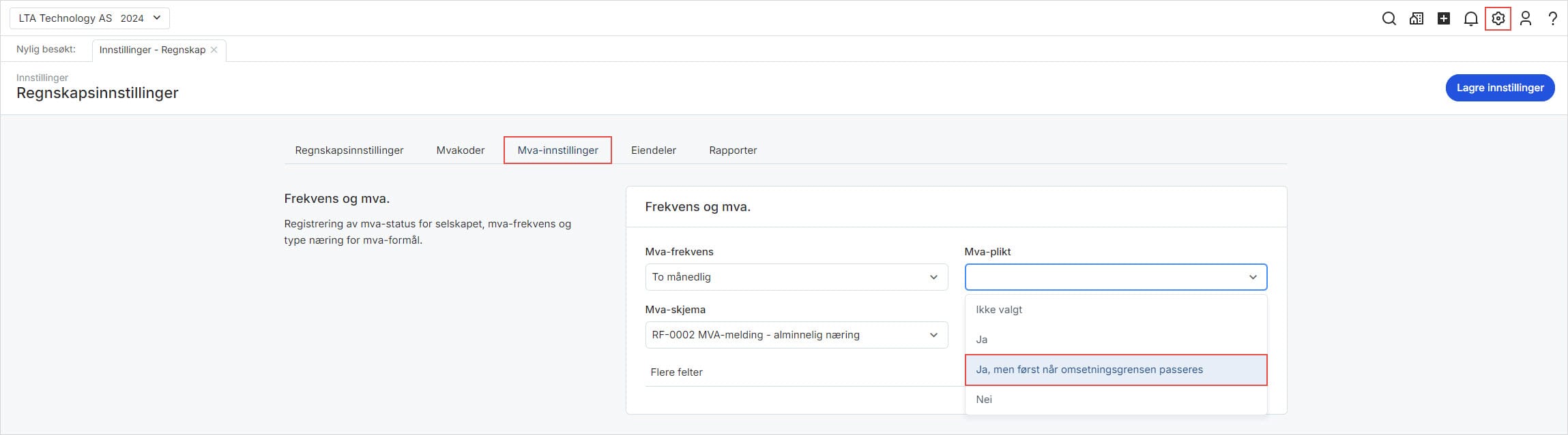 2. Klikk på fanen Mva-innstillinger. I feltet Mva-plikt velger du Ja, men først når omsetningsgrensen passeres.