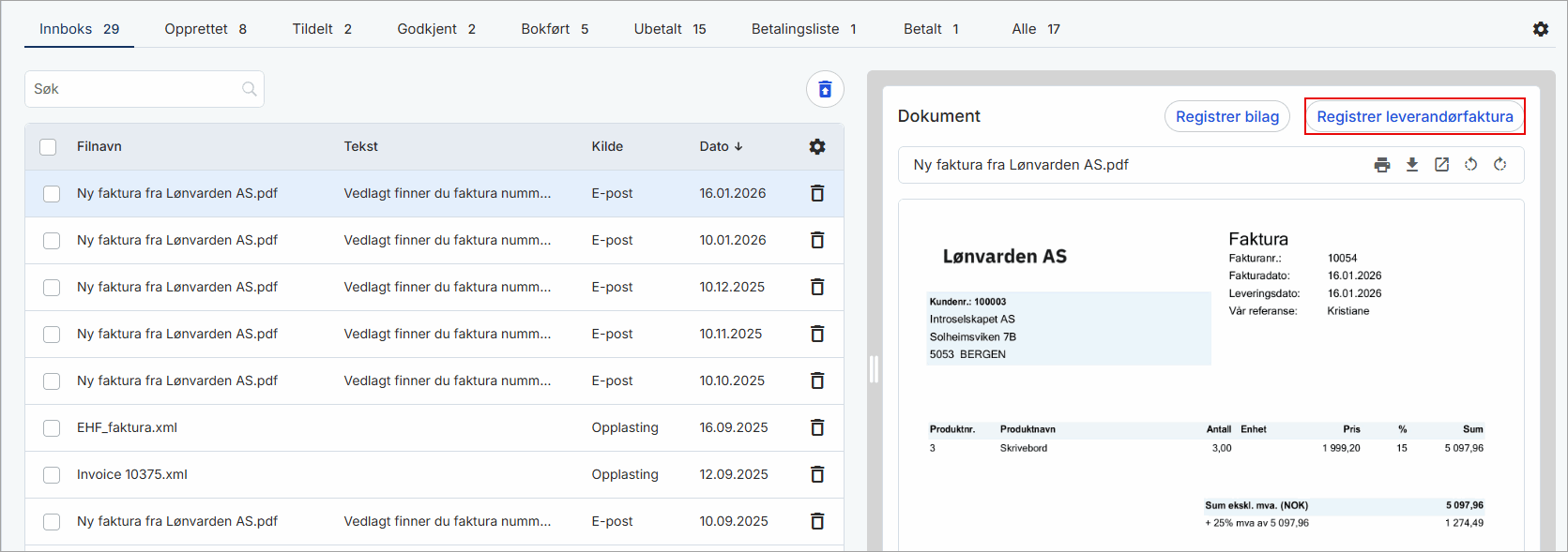 1. Gå til Regnskap i venstremenyen og velg Leverandørfaktura. I innboksen finner du alle filer som er lastet opp, sendt inn til e-postmottaket eller kommet inn som EHF.