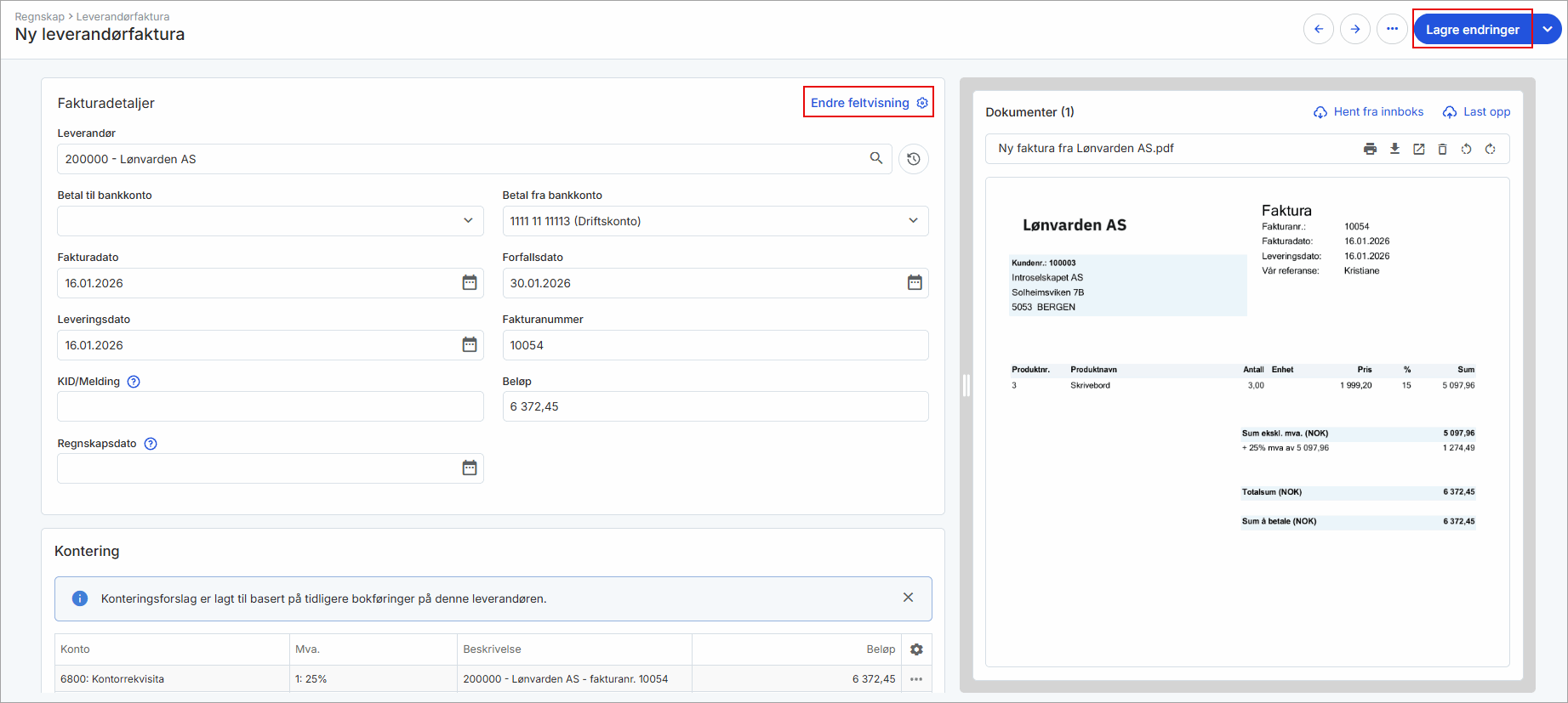 4. Klikk på Lagre endringer. Når en faktura er lagret, kan du bokføre den eller legge den til betaling.