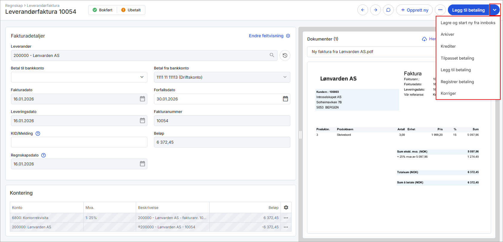Ved å klikke på pilen får du også opp flere valg, blant annet kreditering eller korrigering av føringen. Hvis fakturaen allerede er betalt på andre måter (men vises som ubetalt), kan du klikke på Registrer betaling.