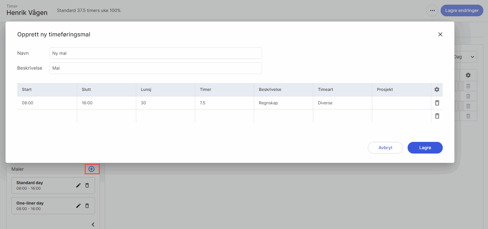 Dersom du har mange like dager, kan du opprette maler for timeregistrering ved å klikke på plusstegnet. Du kan også redigere eller slette eksisterende maler. Ved opprettelse av ny mal må du legge inn Navn og Beskrivelse. Hver mal angir en forhåndsdefinert registrering av timer, og du kan angi følgende info i oppsettet: