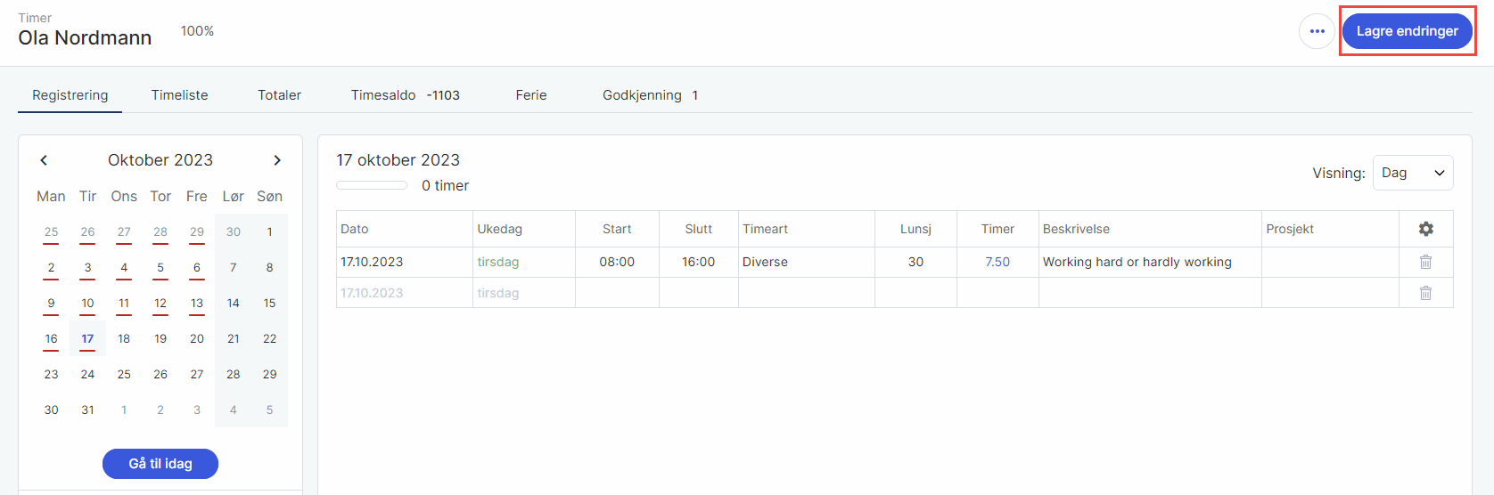 3. Nå kan du føre og endre timeregistreringer på vegne av den angitte brukeren. Du kan også sende inn timer til godkjenning, og låse opp igjen tidligere innsendinger. Navnet til personen du fører for vil være synlig øverst til venstre i bildet.