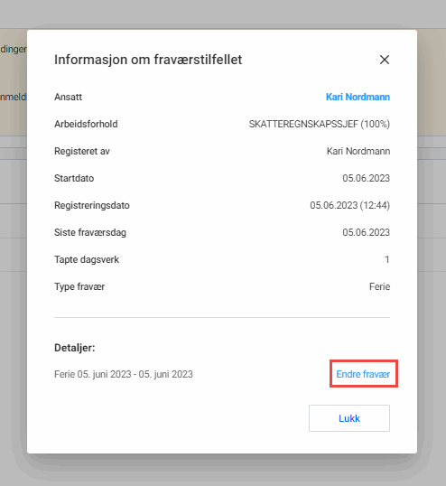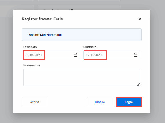 4. Du kan enten endre datoer og klikke på Lagre, eller velge Slett fravær