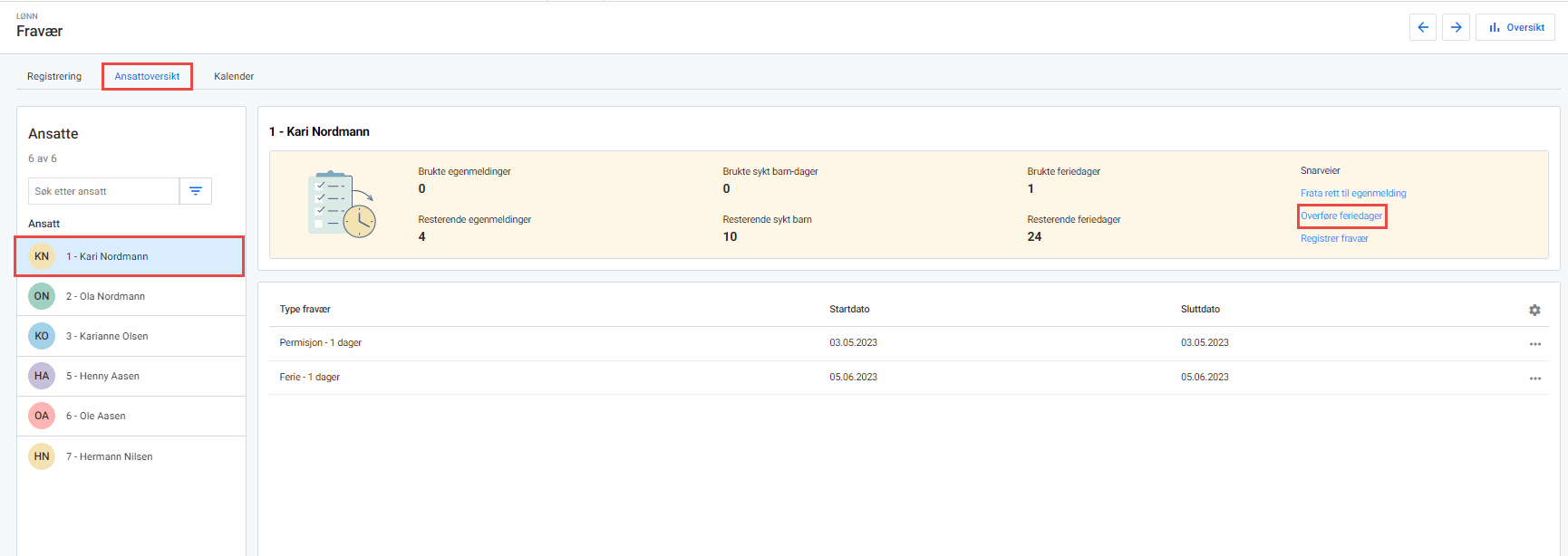 3. Klikk Overfør feriedager. Du overfører feriedager fra året du står i til neste år
