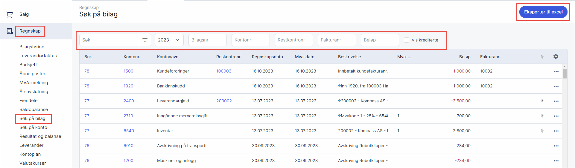 Ved å klikke på Eksporter til Excel får du en eksport av den listen som er aktiv i bildet. Du kan søke etter bilag ved å bruke det øverste feltet og angi bilagsnummer, kontonummer eller beløp. I tillegg kan du bruke søkefeltet for å søke etter bilag basert på fritekst.