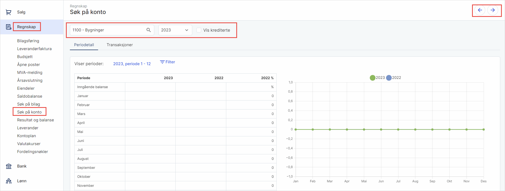 Her får du en oversikt over saldo på en angitt hovedbokskonto. Du velger hovedbokskonto og regnskapsår øverst i bildet. Ved hjelp av pilene øverst til høyre kan du bla deg frem og tilbake i kontoplanen.