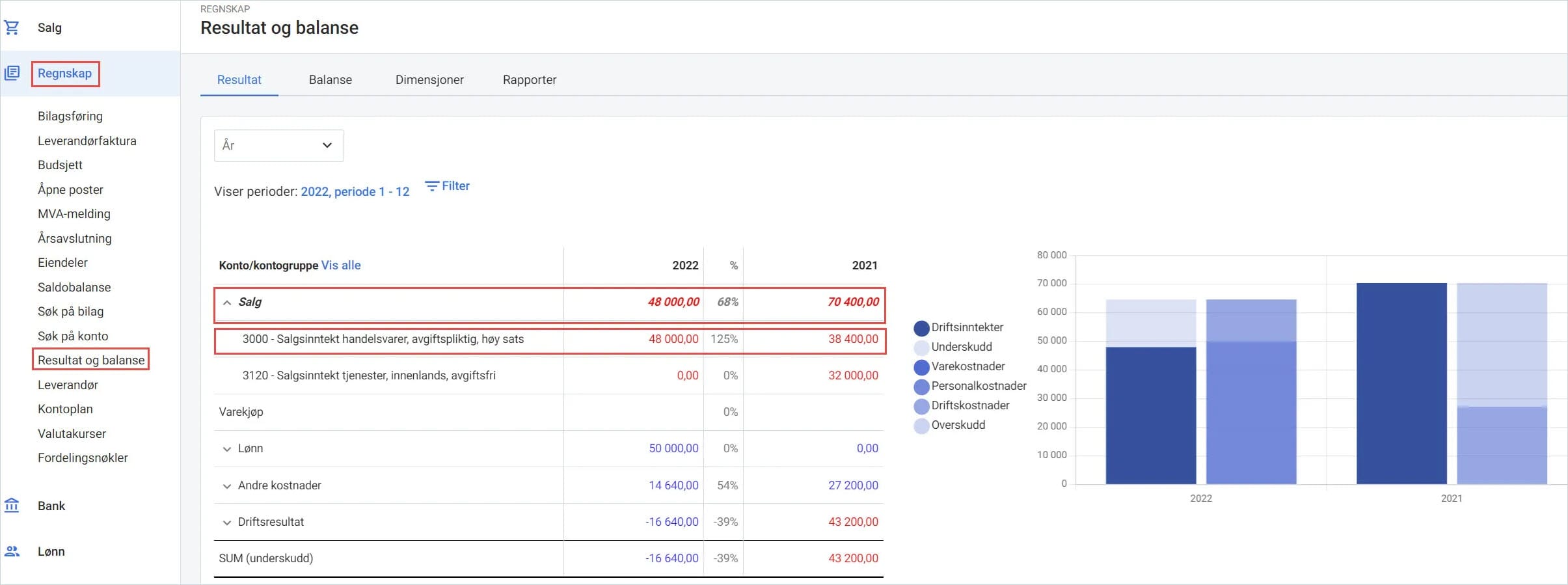 1. Gå til Regnskap i venstremenyen og velg Resultat og balanse.