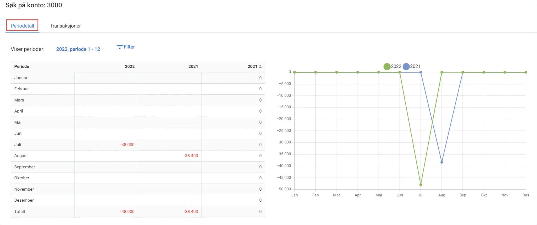 3. Under fanen Periodetall får du en oversikt over kontoen. Du kan også filtrere etter avdeling, prosjekt og andre dimensjoner. Du får et transaksjonsbilde for en gitt måned ved å klikke på aktuell rad.
