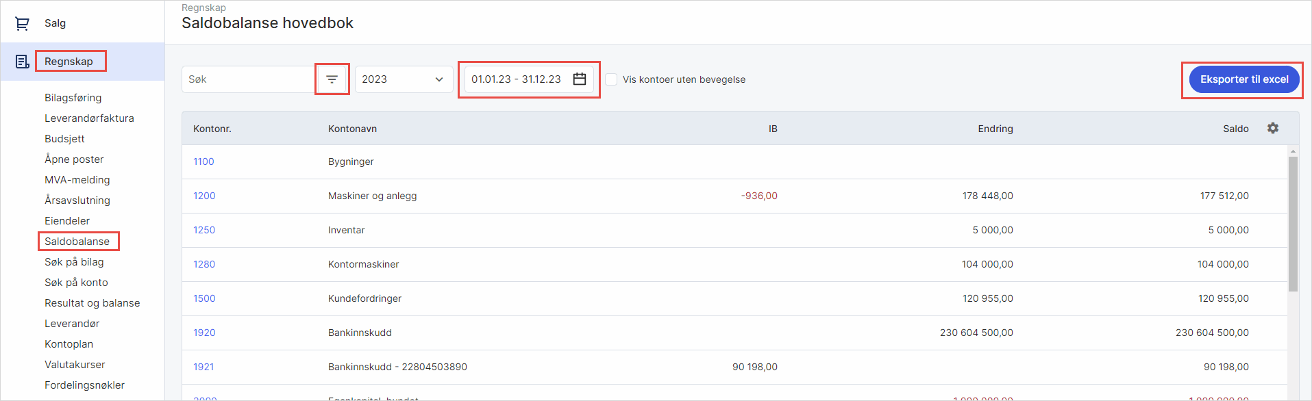 Gå til Regnskap i venstremenyen og klikk på Saldobalanse. Systemet vil som standard gi en visning av hele regnskapsåret, men du kan endre periode ved å klikke på periodevelgeren. For å se transaksjonsdetaljer på en konto, klikker du på gitt kontonummer til venstre. Du kan også filtrere på kontonummer og/eller kontonavn, og eksportere oversikten til Excel.
