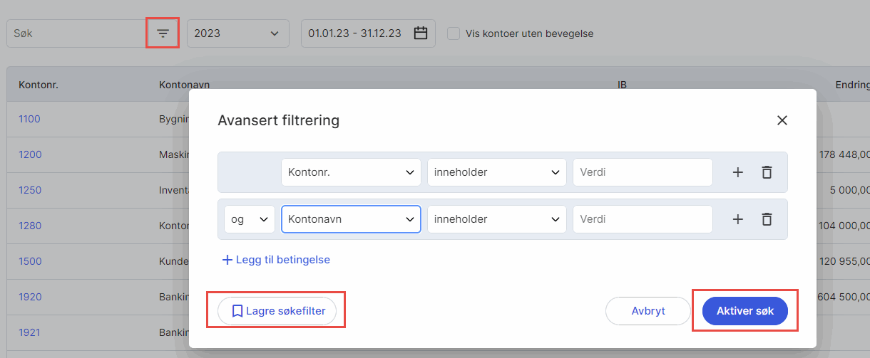 For å aktivere avansert filtrering klikker du på ikonet for filtrering i søkefeltet. Her kan du legge til et valgfritt antall betingelser. Ved mer enn en betingelse kan du selv velge om betingelse nummer to og utover skal være og/eller. Dersom du ønsker å gjenbruke et søkefilter ved en senere anledning velger du Lagre søkefilter. Klikk deretter på Aktiver søk.