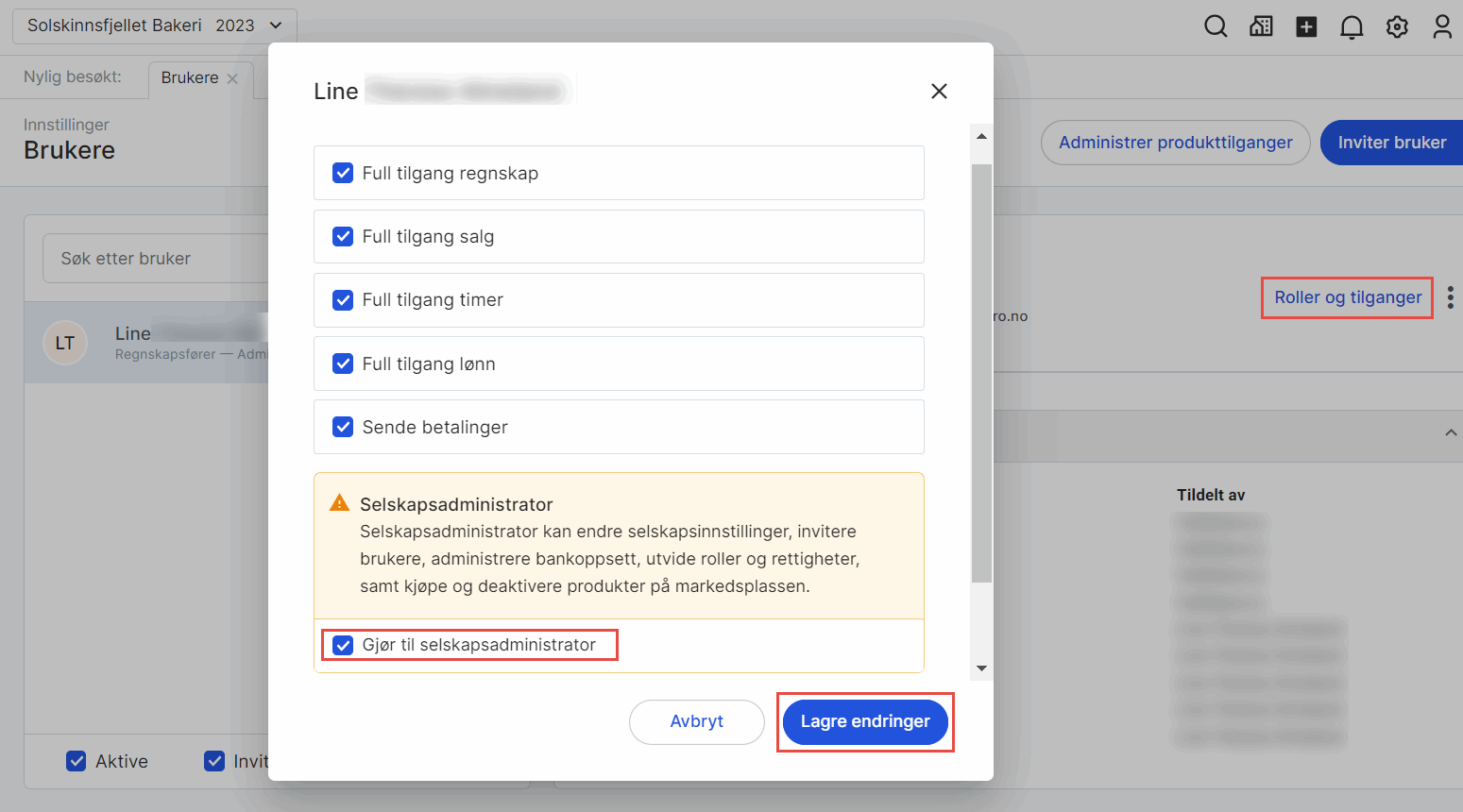 Klikk på Roller og tilganger på aktuell bruker.