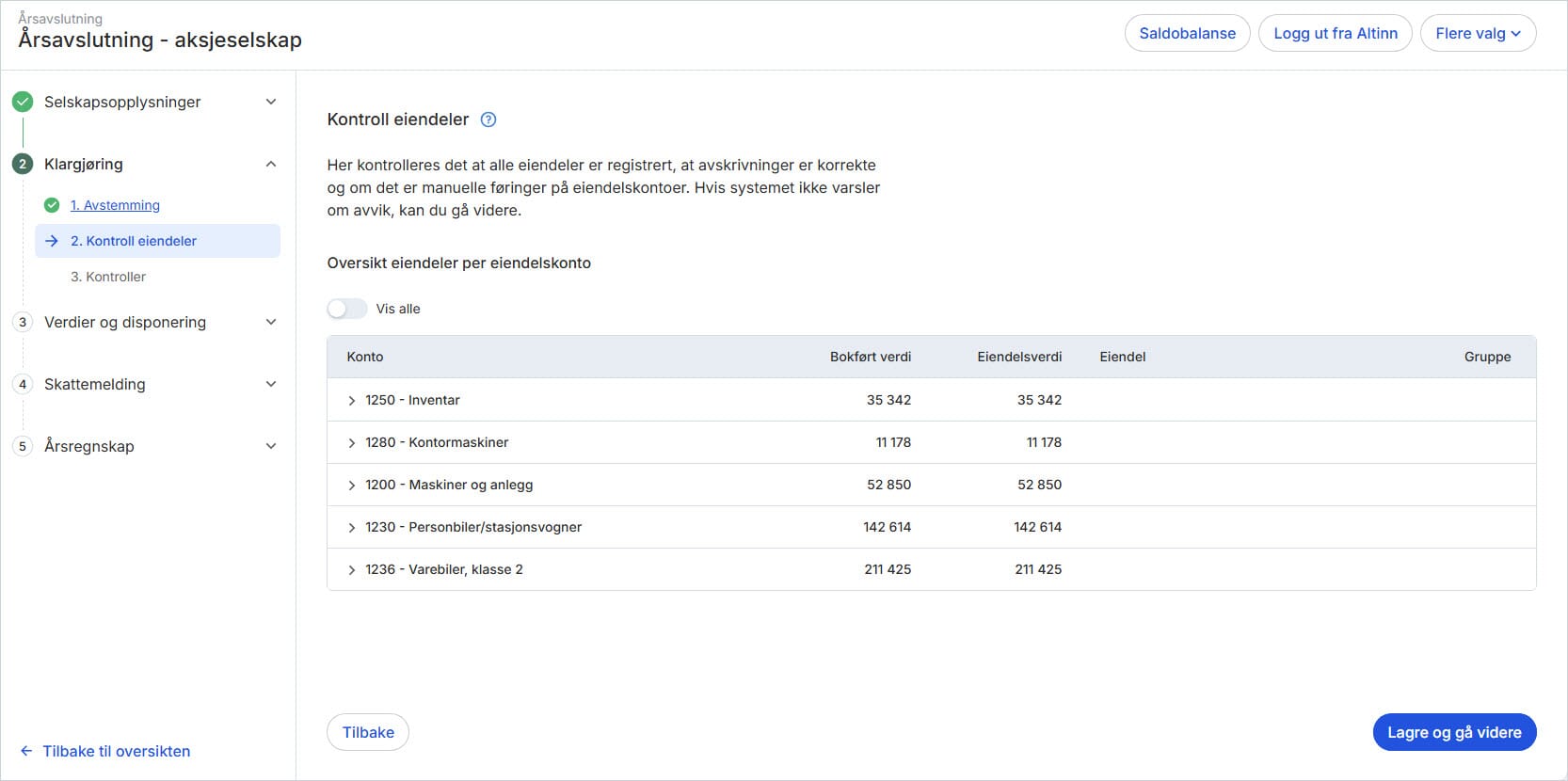 - Bokført verdi og eiendelsverdi per konto samsvarer. Avvik kan oppstå som følge av manuelle avskrivninger i tidligere år eller feilregistrerte eiendeler. Det er ikke mulig å gå videre i årsavslutningen før eiendelene er riktig registrert eller de manuelle avskrivningene er registrert på eiendelen.