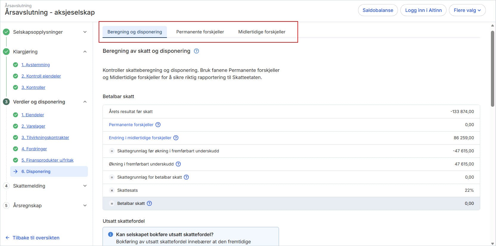 I dette steget beregner systemet betalbar skatt og utsatt skatt eller skattefordel, i tillegg til årets resultat etter skatt og disponeringen av dette.