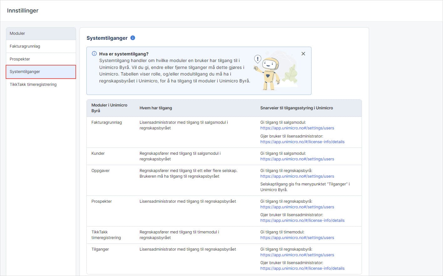 Gå til Innstillinger i toppmenyen og velg Systemtilganger. Her finner du en detaljert oversikt over hvordan byrået sine egne brukere kan få tilgang til de forskjellige funksjonene i Unimicro Byrå.